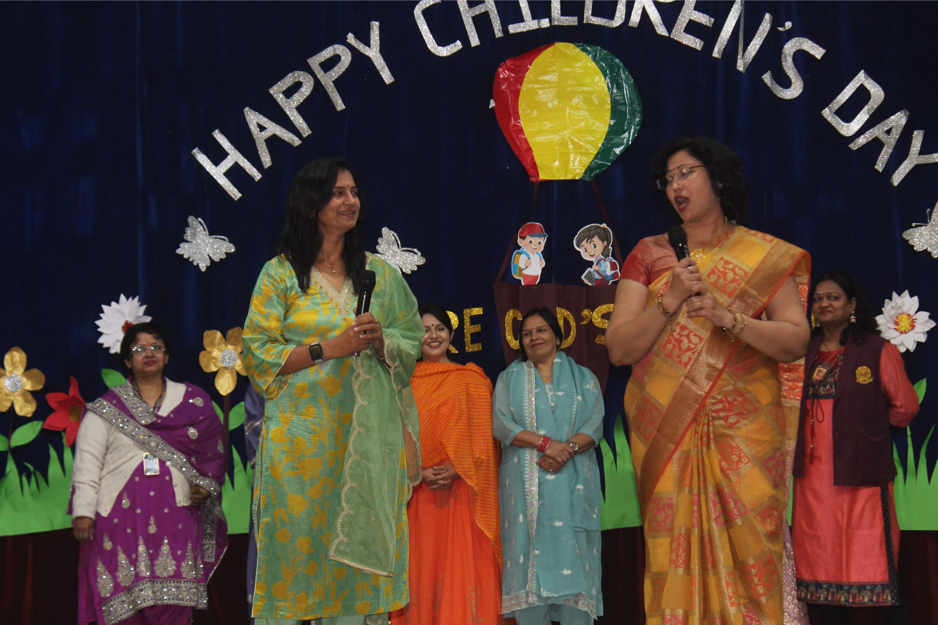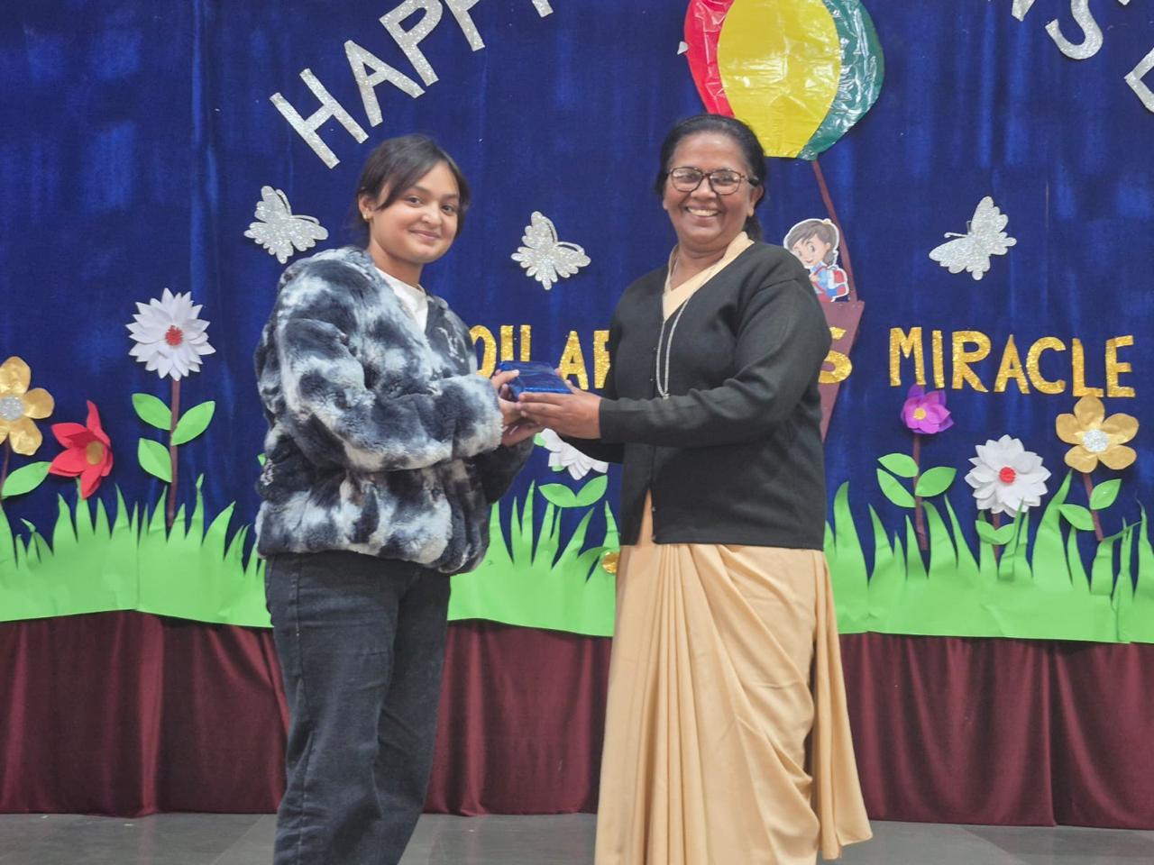 The celebration unfolded with a delightful variety of performances. A humorous enactment on idioms and a creative presentation titled "Daily Diary of a Student”—capturing the journey from morning to the last period—filled the hall with laughter. Teachers also presented a melodious guitar and song performance, an energetic dance medley, engaging tongue twisters, and concluded the event with an eye-catching VIBGYOR-themed fashion show,aptly titled “The Prism Parade".