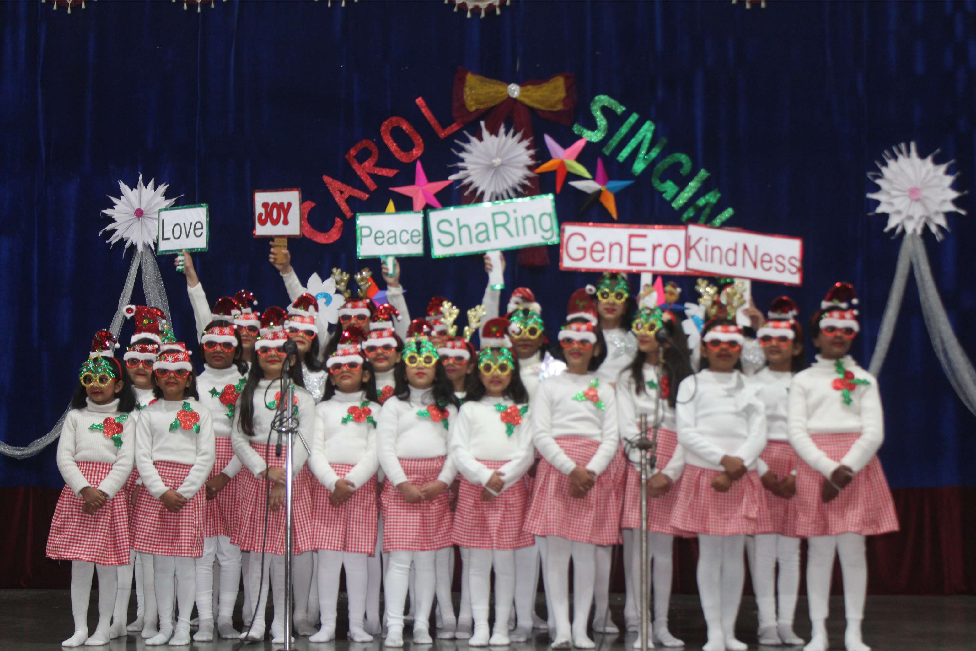 With Christmas around the corner, an inter - house Carol Singing Competition for the entire school was held on 19th December 2025. The participants from grade I to grade 4 put forth an enthralling performance. The competition was held house wise and all the 4 houses did marvellous singing. The venue wasi the school auditorium and it lasted from 8:30 to 11:00am. The competition was judged by Ms. Lizy James, the school coordinator and the school IT head Mr. Tanishq. The occasion was graced by the Vice Principal Sr. Bhavana and Sr. Flavia.